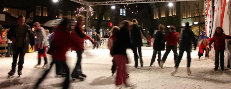 Die Eisbahn auf dem Marktplatz in Beckum lädt die Ganze Familie zum Schlittschuhlaufen ein.