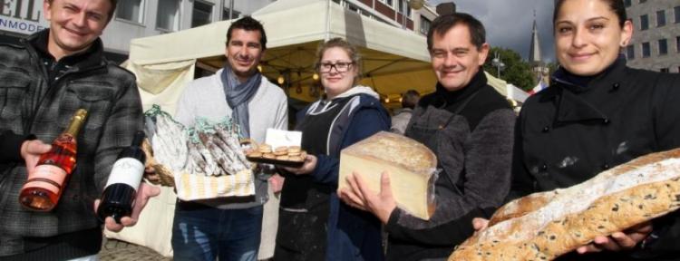Schlemmen wie Gott in Frankreich können die Besucher des Französischen Gourmetmarktes. Gut ein Dutzend Händler aus verschiedenen Regionen Frankreichs bieten teils selbst hergestellte Waren auf dem Dr.-Ruer-Platz an.