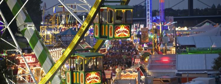 Auf den malerisch gelegenen Oberkasseler Rheinwiesen baut sich die große Kirmesstadt auf. Auf 165.000 Quadratmetern präsentieren Schausteller aus dem In- und Ausland eine riesige Auswahl an Fahrgeschäften und garantieren damit Spaß für die ganze Familie.