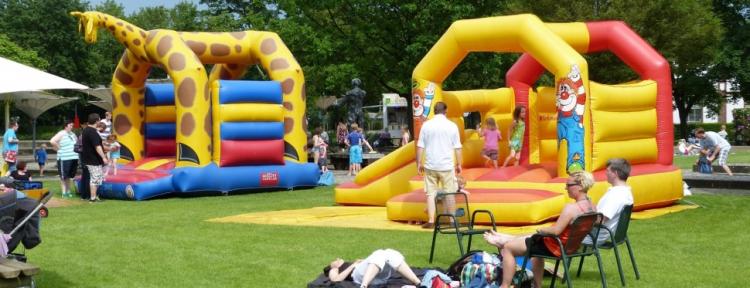 Zahlreiche bunte Hüpfburgen in vielen Fomen und Größen stehen auf der Wiese am Glaslelefanten für die kleinen Besucher parat.