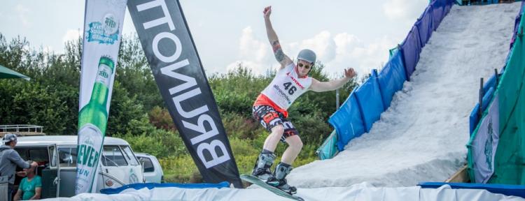 Direkt am Biergarten vor der Skihalle wird eine zehn Meter lange, schneebedeckte Rampe aufgebaut, auf der sich waghalsige Sportler beim Waterslide messen.