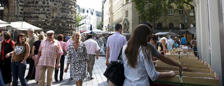 Der Antikmarkt in der Bonner Innenstadt mit rund 200 Ständen bietet den Besuchern eine große Auswahl an Antiquitäten.