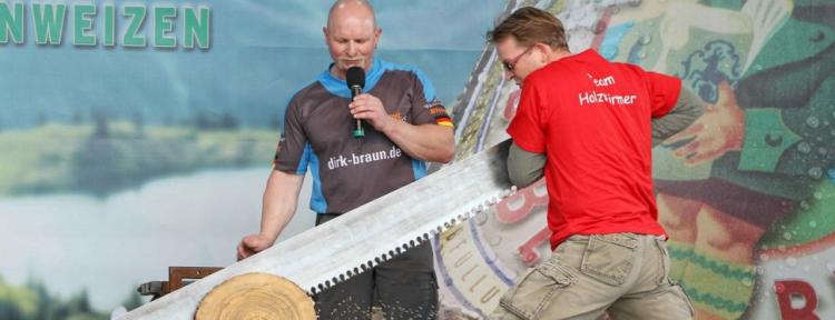 Am „Tag der Arbeit“ fliegen ab 11 Uhr Schweiß und Holzspähne. Kräftige Vierer-Teams wetteifern nämlich bei den internationalen Holzhackmeisterschaft um die Plätze.
