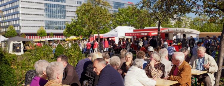 Einmal im Monat werden hier Wochenmarktprodukte, Kunsthandwerk und ein vielfältiges Gastronomieangebot aus aller Welt an den Mann und an die Frau gebracht.